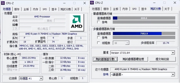 Im CPU-Z-Test zeigte der Ryzen R9-7940HS Prozessor eine beeindruckende Leistung und erreichte bemerkenswerte 659,6 Punkte im Single-Core-Test und sogar beeindruckende 7082,9 Punkte im Multi-Core-Test. Dies ist die höchste Punktzahl, die ich bisher bei den verschiedenen CPUs erreicht habe, die ich verwendet habe. Diese außergewöhnlichen Ergebnisse unterstreichen die Rechenleistung des Ryzen R9-7940HS und sein Potenzial, das Computererlebnis auf ein beispielloses Niveau zu heben.