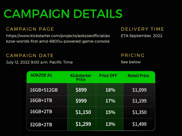 AOKZOE formally announced the price of the first AMD Ryzen 7 6800U CPU console to be mass-produced, and this is none other than the AOKZOE A1 . Which will appear on Kickstarter Crowdfunding platform at a starting price of $899 , the price for which they will offer you the variant with 16 GB of RAM and 512 GB of internal storage and that will then go up to $ 1,099 if you are not one of the first to get it. The variant with 1 TB of storage will cost $999 (later $1,199), with 2 TB of storage it already reaches $1,150 (later $1,350), and the top-of-the-line model, with 32 GB RAM and 2 TB of capacity, will go for $1,299 (later $1,499).