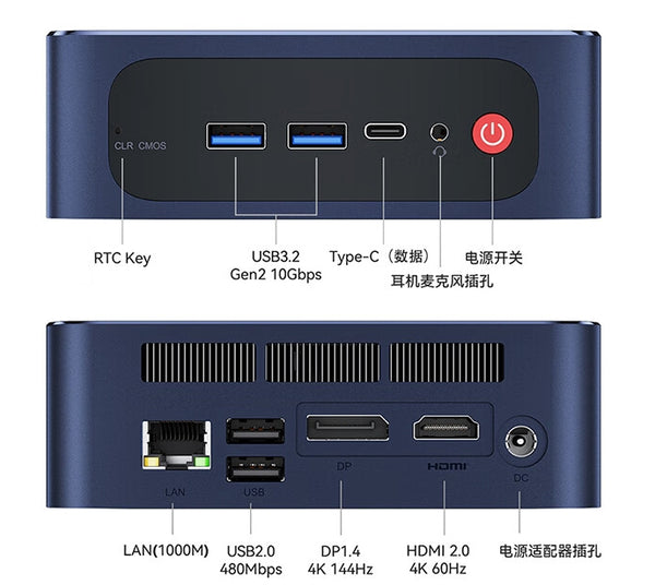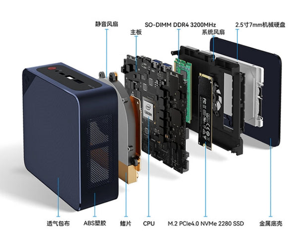 The Beelink SEi12 Mini PC boasts a compact design, measuring approximately 113mm x 126mm x 42mm. Available in two stylish colors, "Navy Blue" and "Millennium Grey," the mini PC's outer shell is crafted with breathable and waterproof cloth. The device is further enhanced with an ABS plastic upper cover, a metal air inlet grille, and a durable metal bottom shell, combining aesthetics with durability.