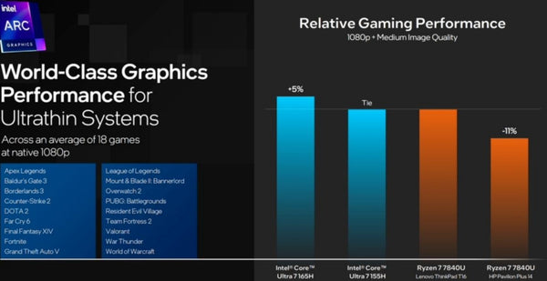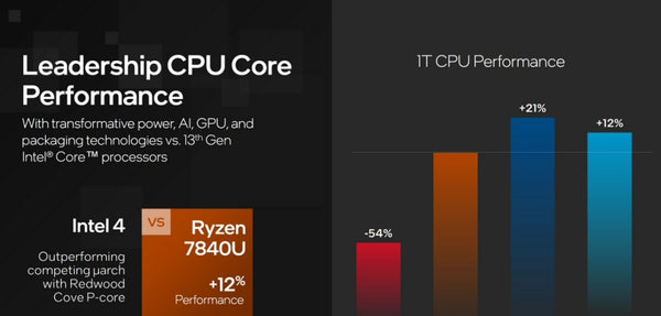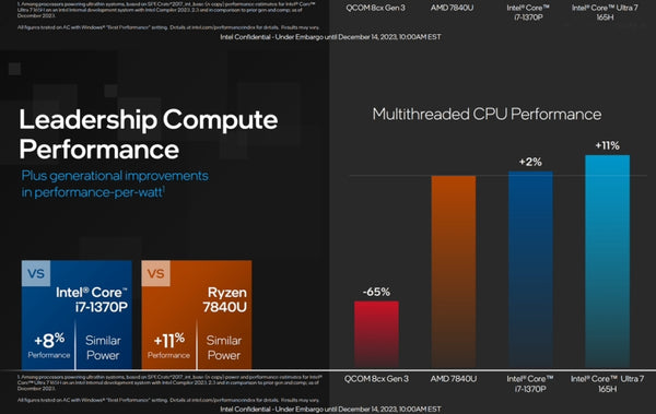The Core Ultra 7 165H CPU, part of Intel's latest series, has showcased impressive performance gains in official tests. In a single-threaded test, it outperformed AMD Ryzen 7 7840U by 12% and surpassed Qualcomm 8cx Gen 3 by a considerable margin. In multi-threaded performance tests, the Core Ultra 7 165H maintained an 8% lead over Ryzen 7 7840U in "Balanced" mode and extended it to 11% in "Maximum Performance" mode.