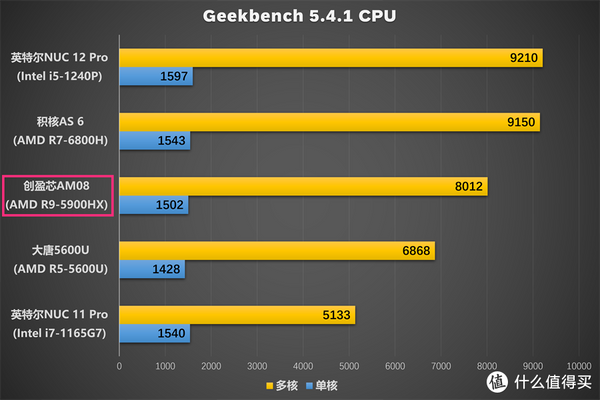 In the Geekbench5.4.1 CPU performance test, AM08's CPU single-core score is 1502, and the multi-core score is 8012. Compared with the Mini PCs of Ryzen 7 6800H and Core i5-1240P, the gap is not very big.