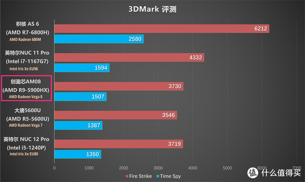 Among the two tests of 3DMark Time Spy and Fire Strike. The scores of AM08 are 1507 and 3730 respectively, which is quite different from the Mini PC equipped with 6800H processor and Radeon 680M core display, but slightly better than the NUC12 Pro equipped with Core i5-1240P. In general, AM08 is not suitable for running the latest AAA games, but more suitable for playing mainstream games that do not require high graphics card performance.