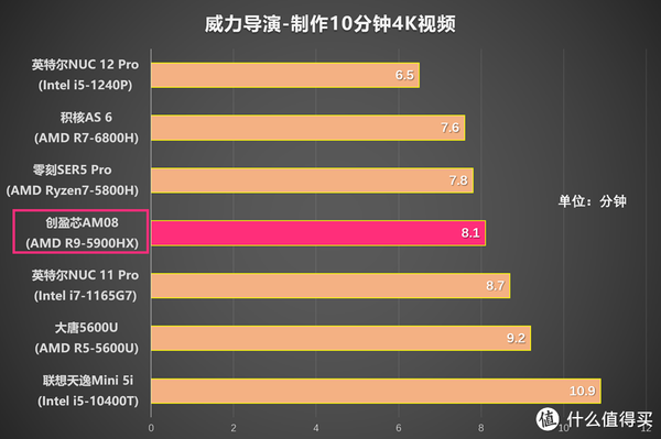 To generate a 10-minute 4K30fps video in PowerDirector, AM08 takes 8 minutes and 7 seconds, which is slower than Zero Moment SER5-5800H, probably because it is dragged down by the speed of SATA SSD.